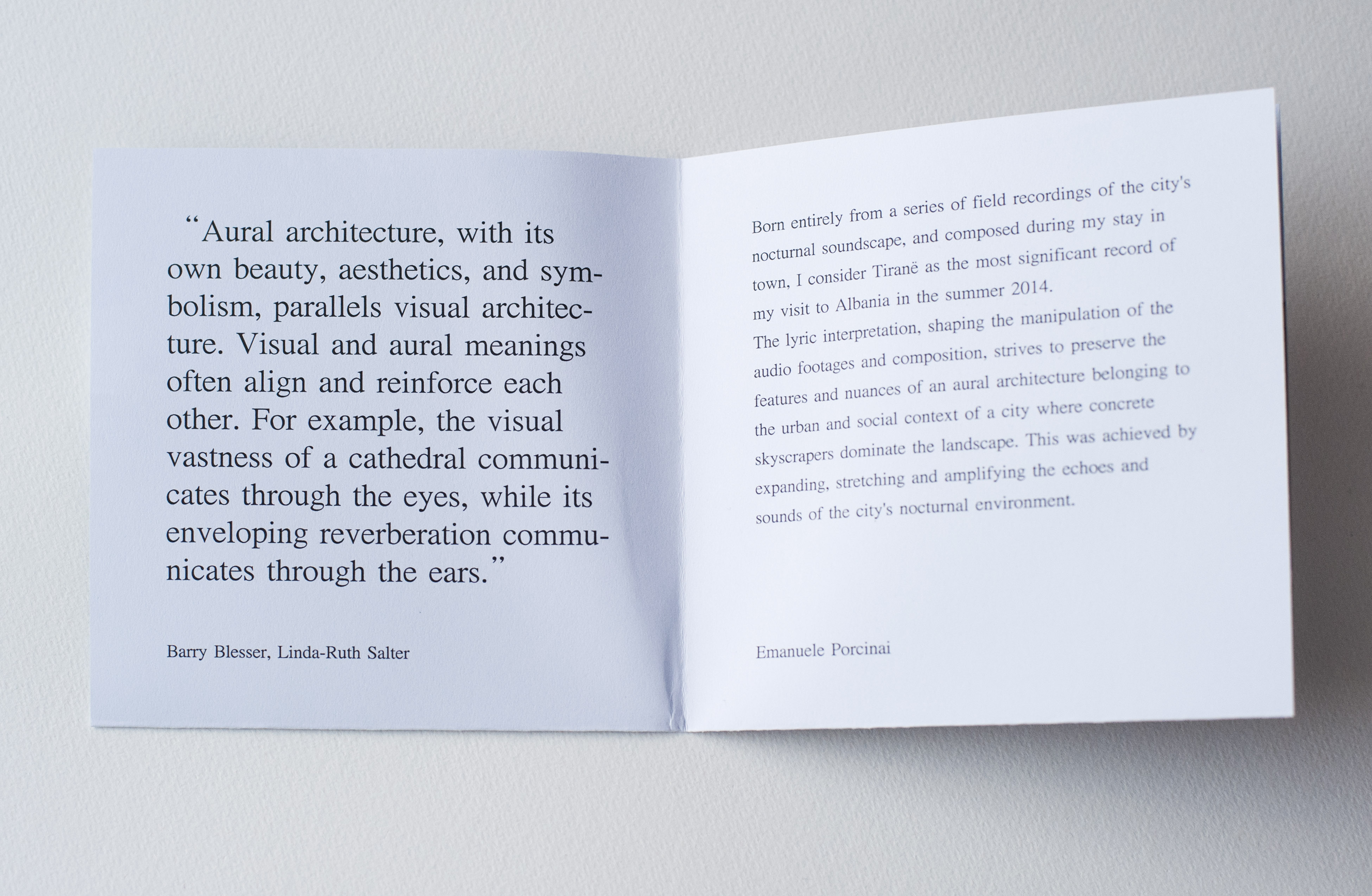 Graphic design for Emanuele Porcinai’s release, “Tiranë” - a collection of field recordings and compositions realised as part of a research project on aural architecture carried out in Tirana, Albania.